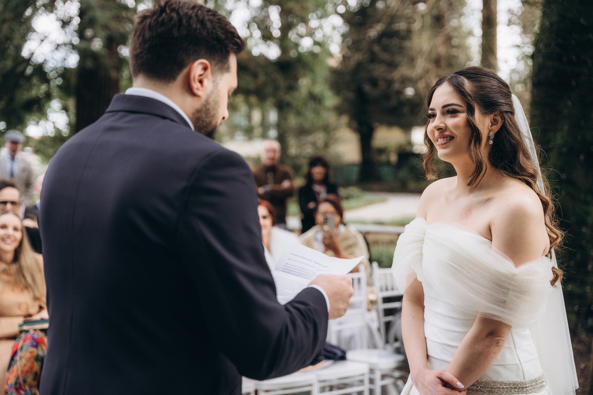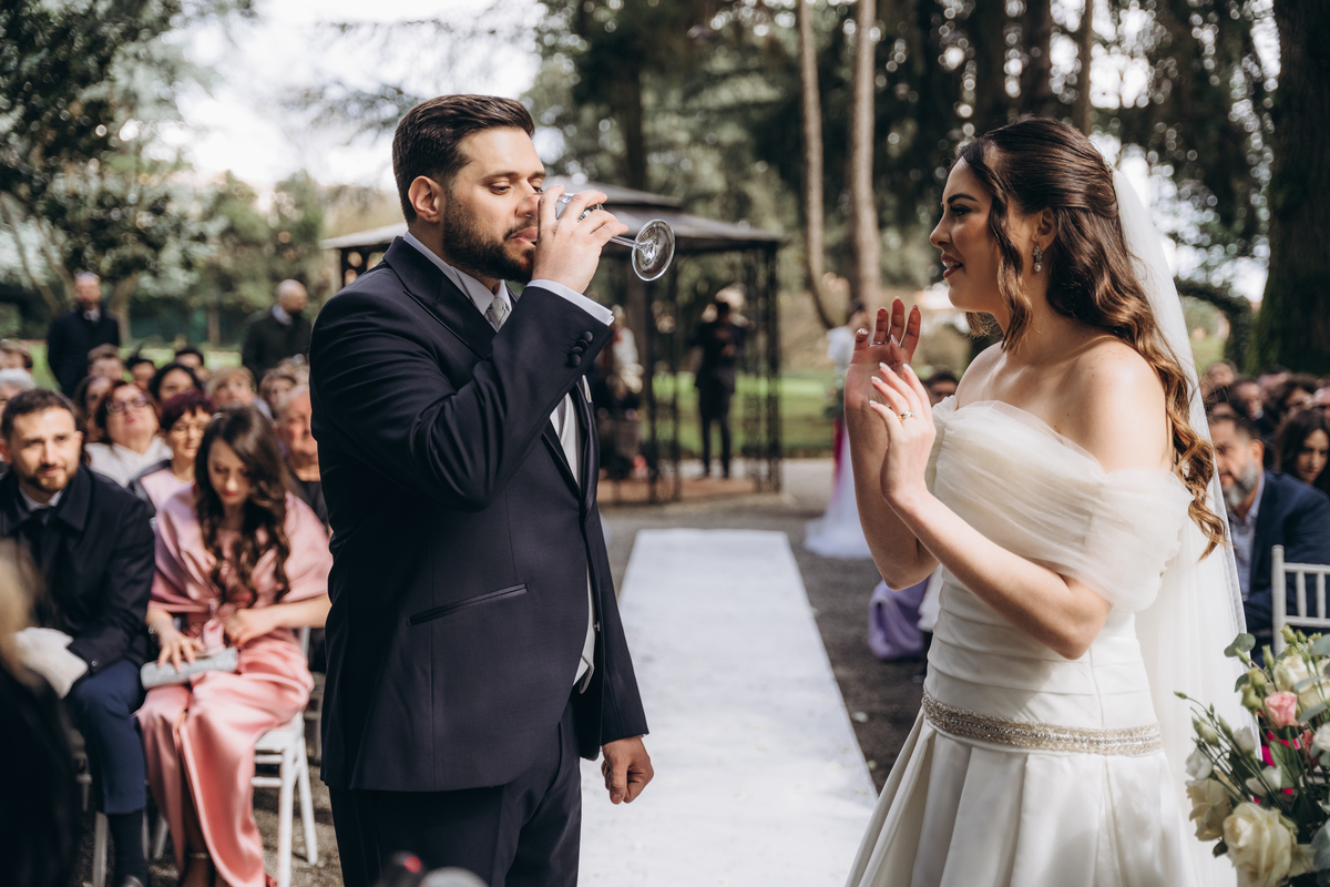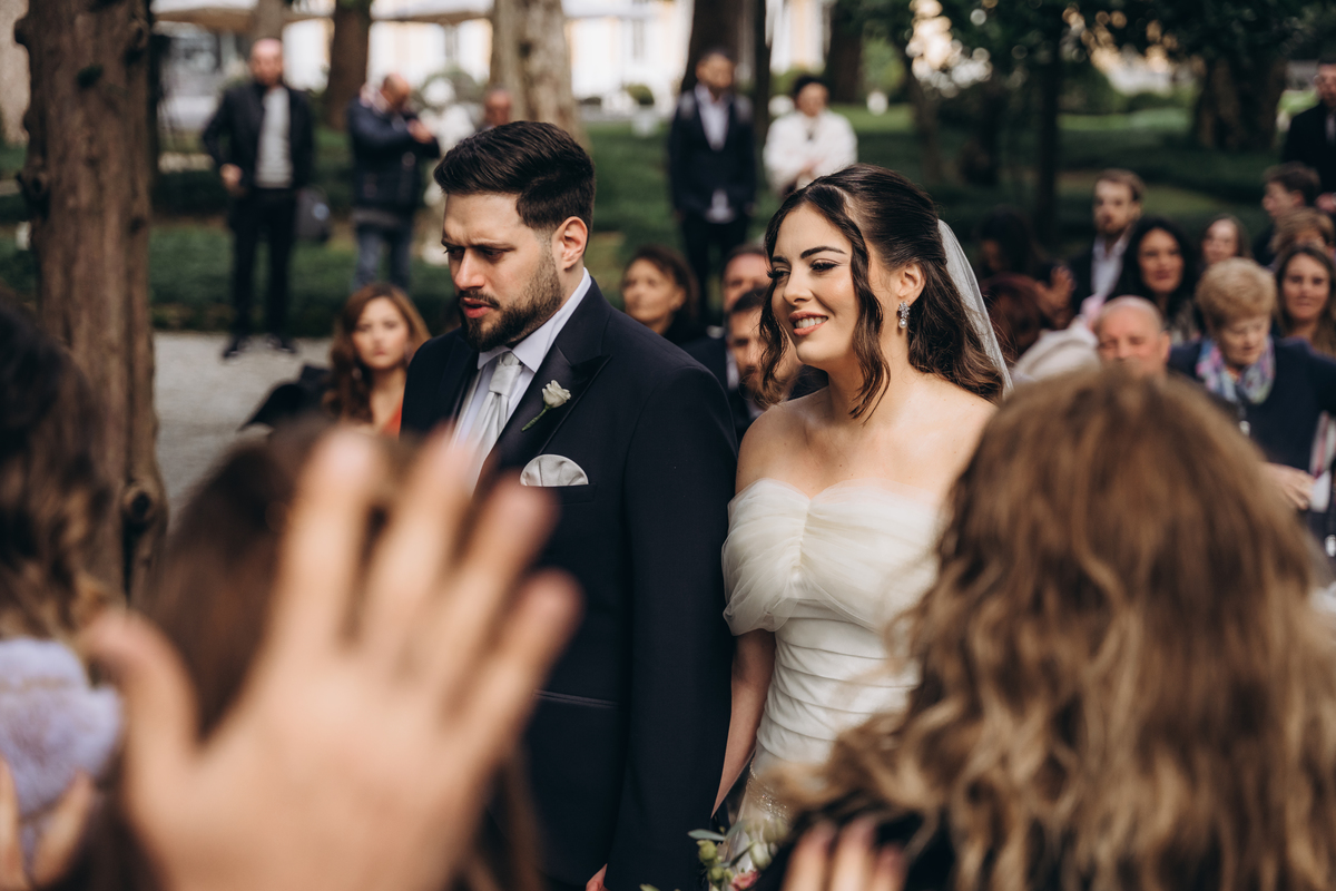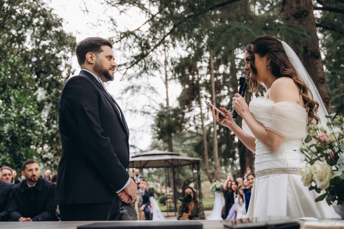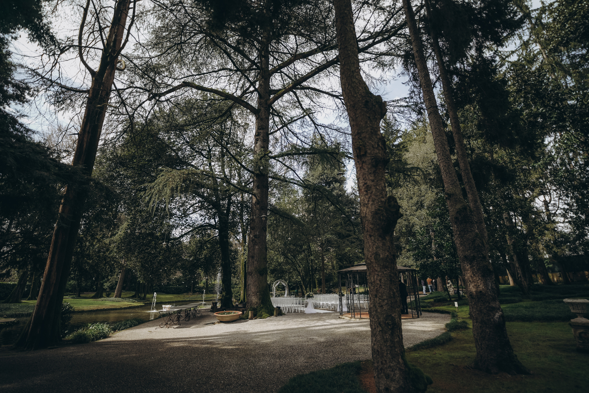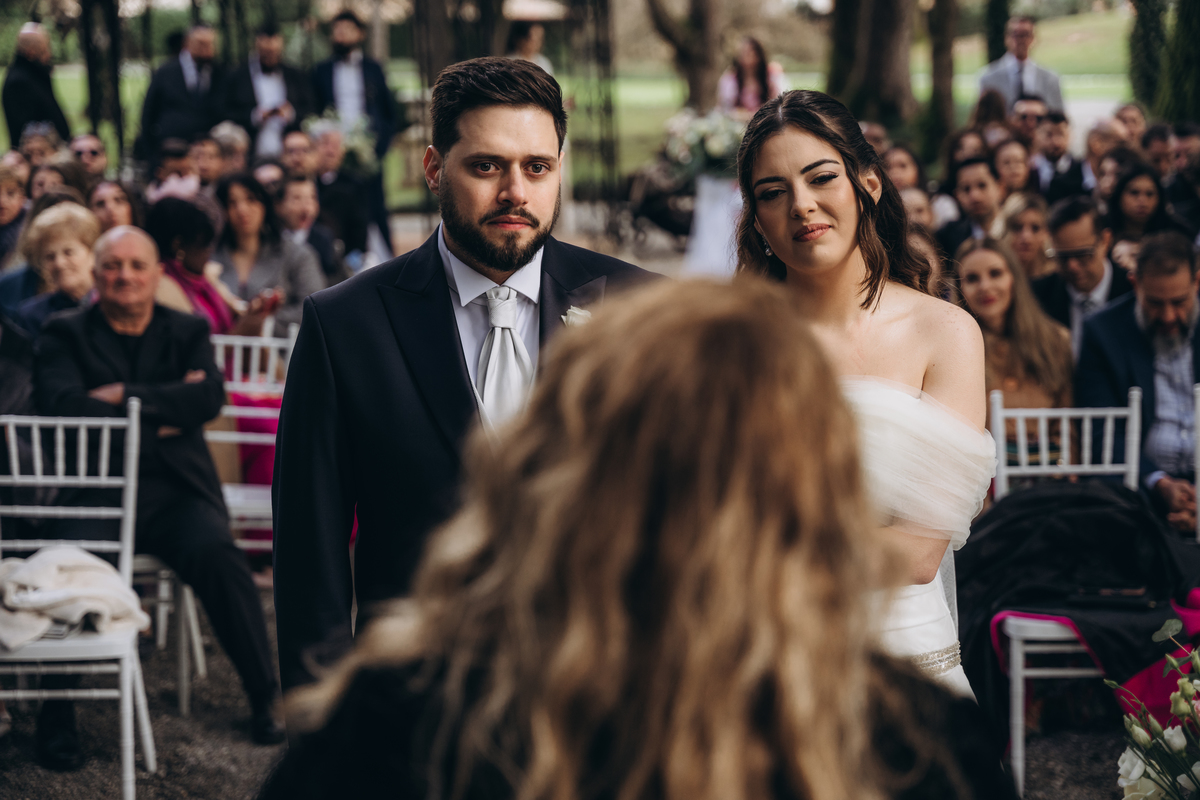 La cerimonia si è svolta in un luogo incantevole, all’aperto, circondato da alberi secolari e con una bellissima villa sullo sfondo, che sembrava fatta apposta per un momento così speciale. È stato un matrimonio autentico, emozionante e pieno di bellezza naturale — di quelli che ti fanno sospirare a ogni scatto.