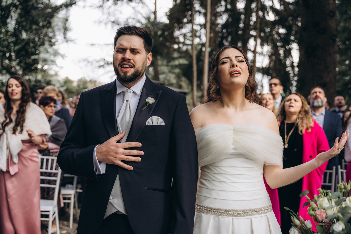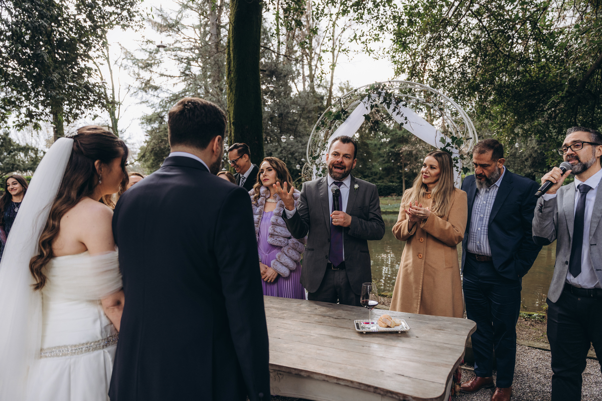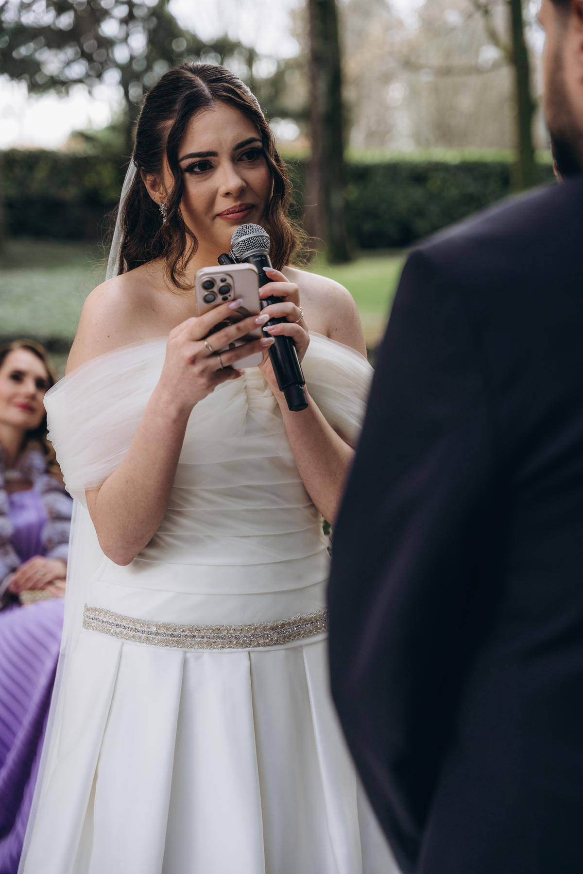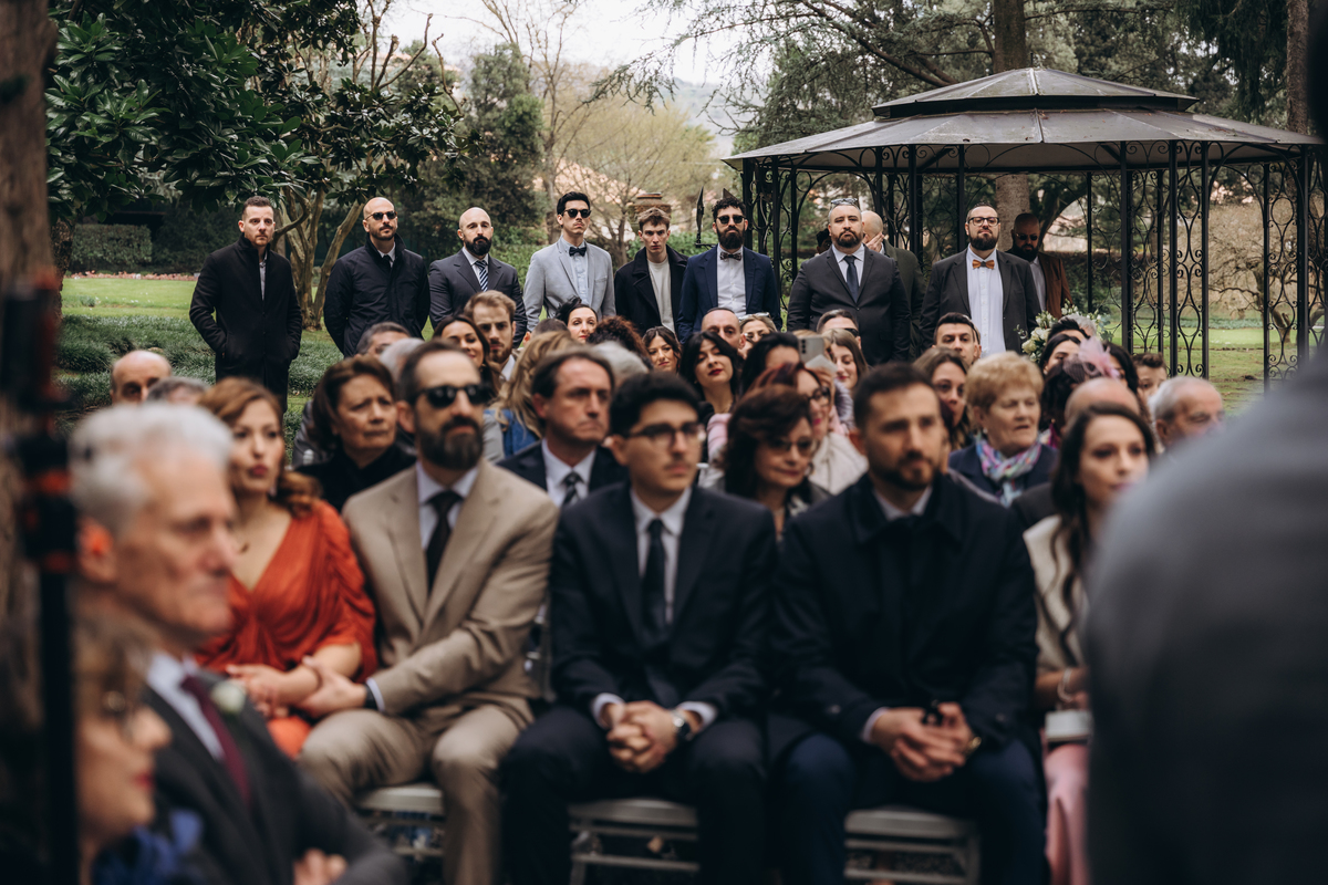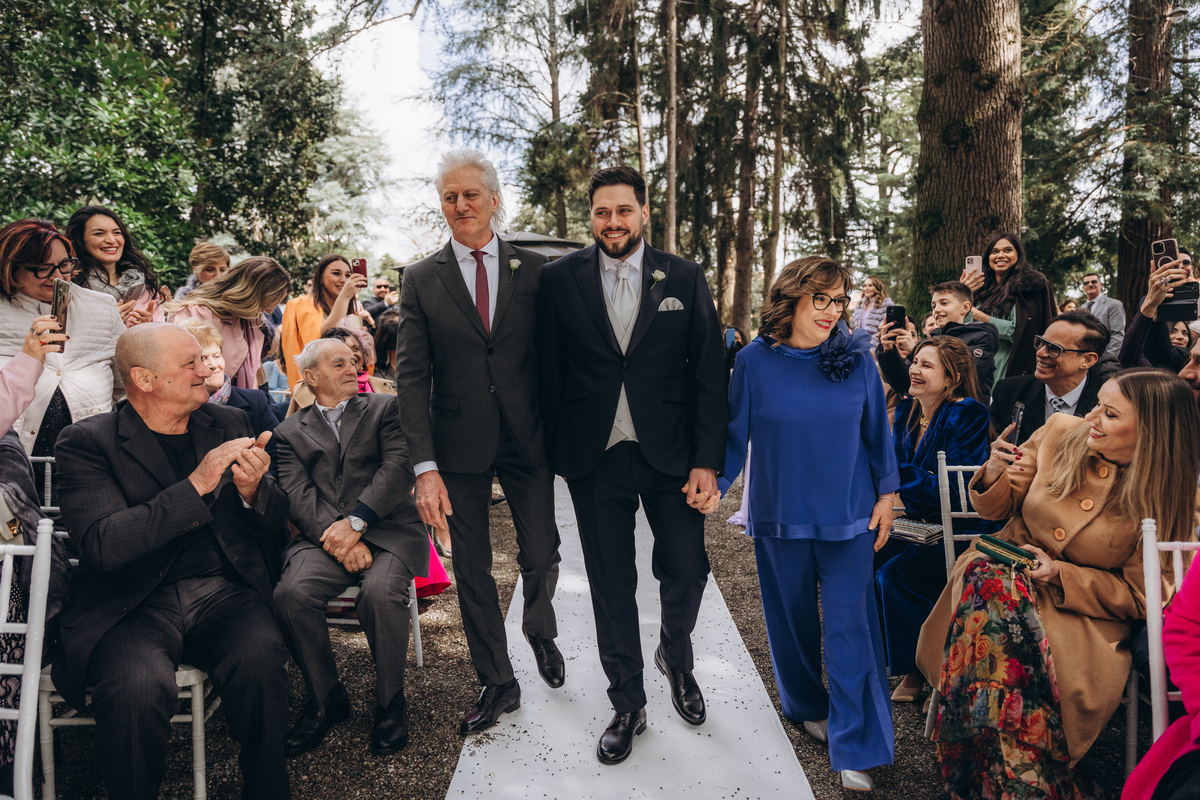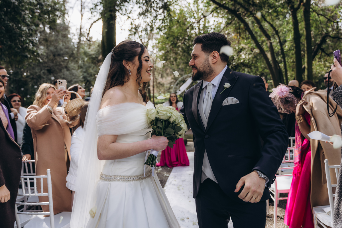 La cerimonia si è svolta in un luogo incantevole, all’aperto, circondato da alberi secolari e con una bellissima villa sullo sfondo, che sembrava fatta apposta per un momento così speciale. È stato un matrimonio autentico, emozionante e pieno di bellezza naturale — di quelli che ti fanno sospirare a ogni scatto.
