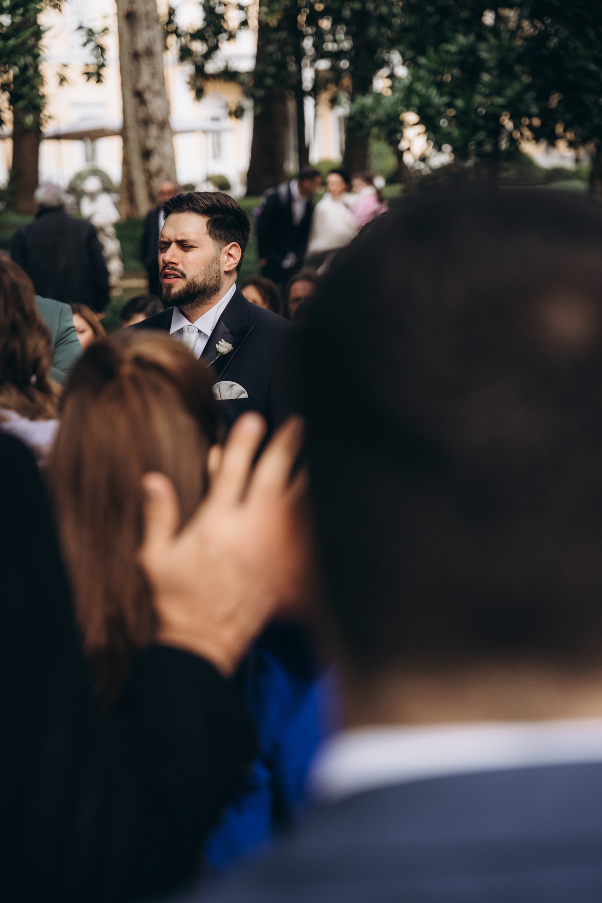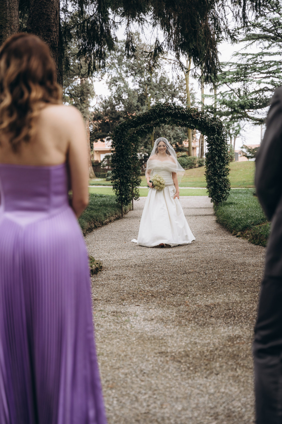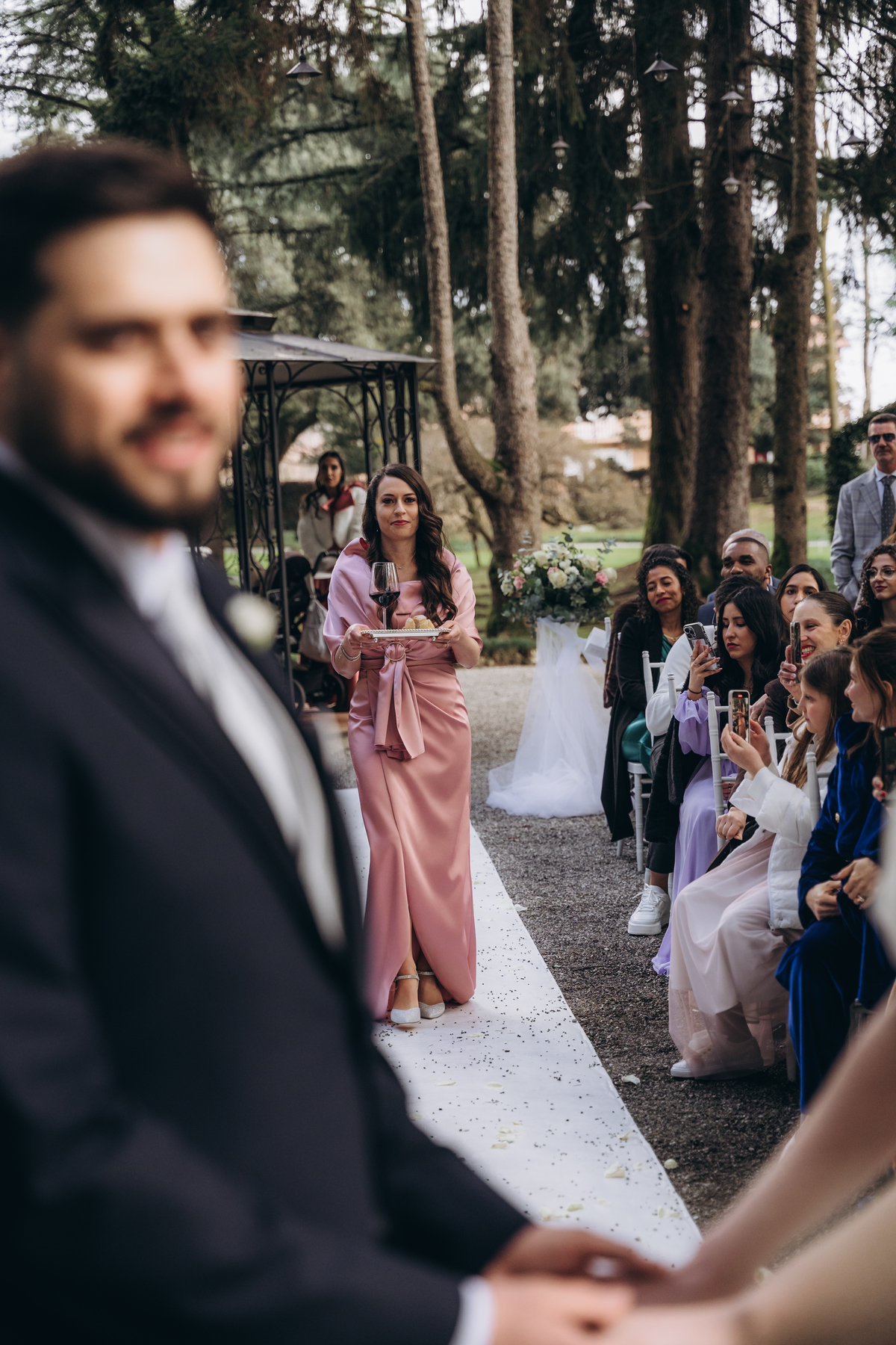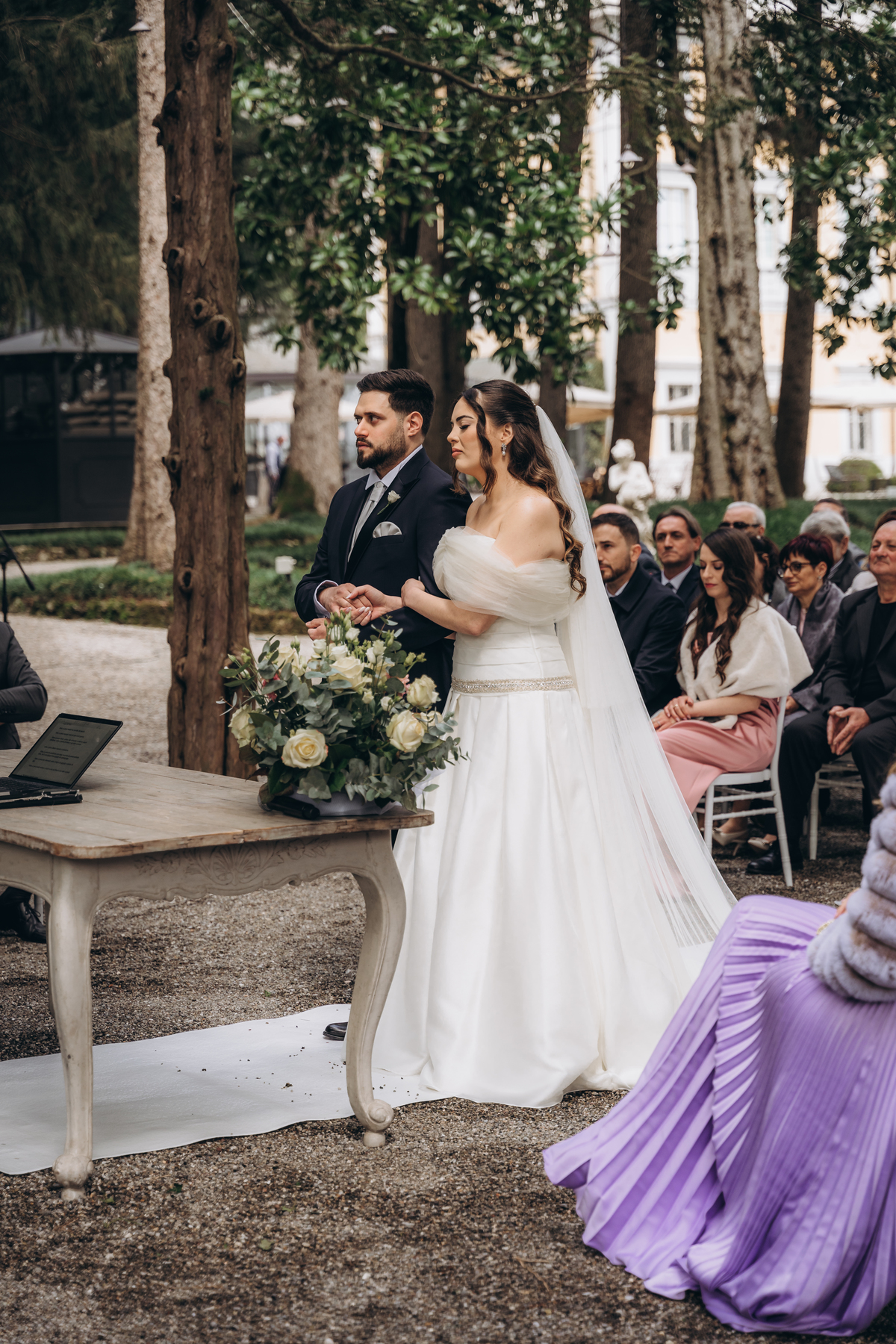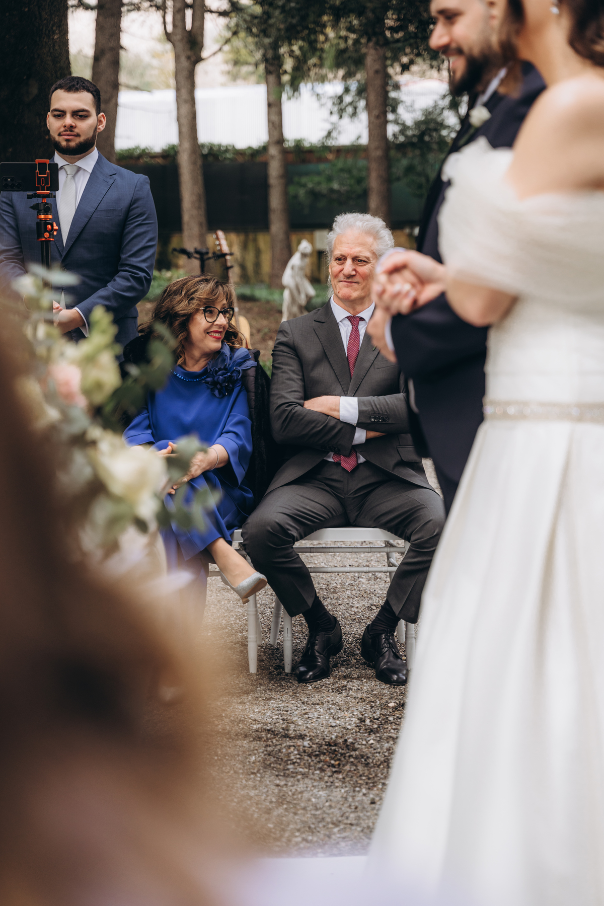 La cerimonia si è svolta in un luogo incantevole, all’aperto, circondato da alberi secolari e con una bellissima villa sullo sfondo, che sembrava fatta apposta per un momento così speciale. È stato un matrimonio autentico, emozionante e pieno di bellezza naturale — di quelli che ti fanno sospirare a ogni scatto.