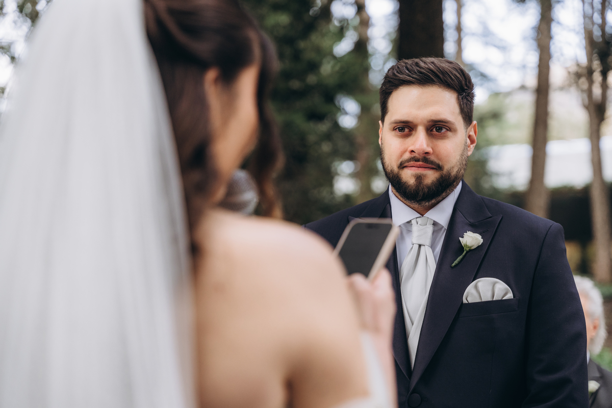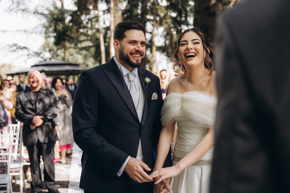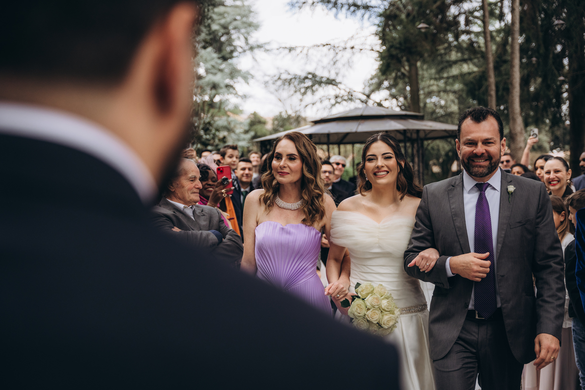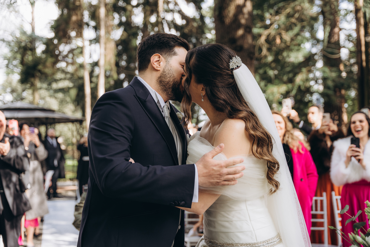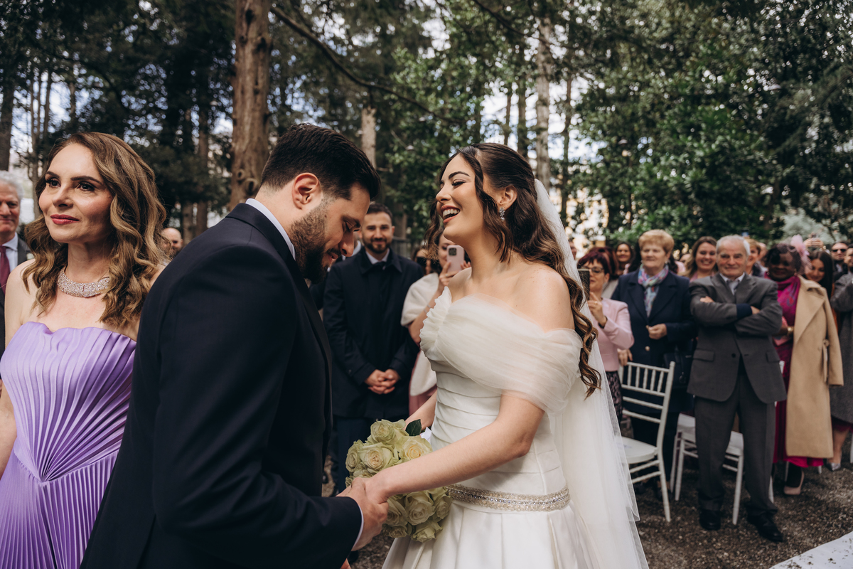 A cerimônia aconteceu em um local encantador, ao ar livre, cercado por árvores centenárias e com um belo casarão ao fundo que parecia ter sido feito sob medida para esse momento. Foi um casamento cheio de autenticidade, emoção e beleza natural — do tipo que faz a gente suspirar a cada clique.